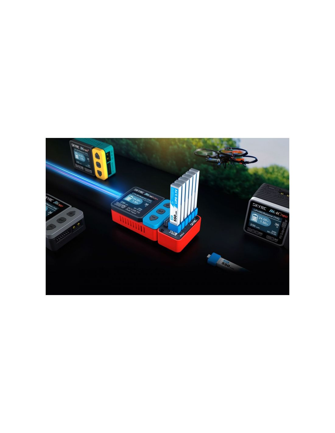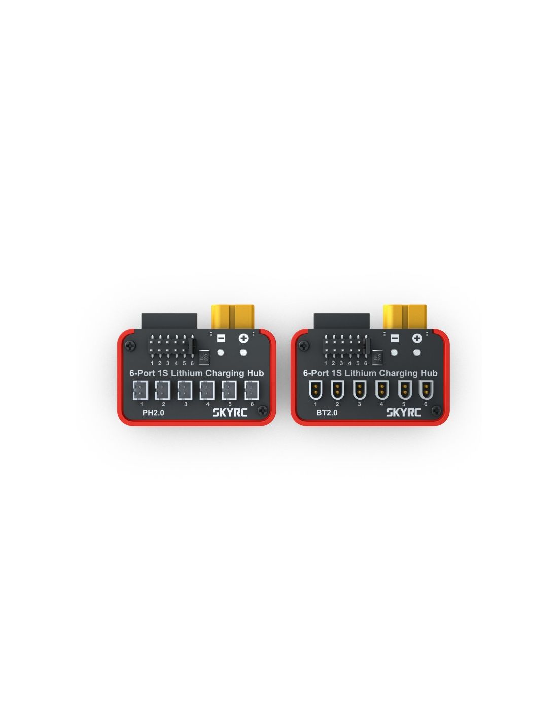 Ce hub doit être utilisé avec les chargeurs SkyRC B6neo, B6ACneo, B6neo+, ou B6neo Ultra, permettant de charger et décharger simultanément jusqu’à six batteries lithium 1S avec un courant allant jusqu’à 2,0 A.