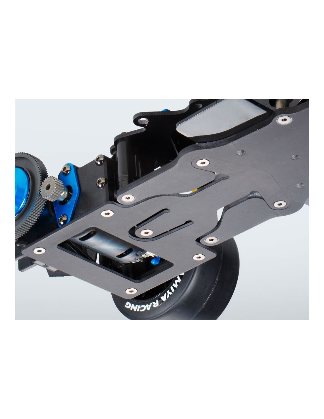 Le châssis utilise un double plateau en fibre renforcée permettant d’obtenir une bonne rigidité tout en conservant un certain flex pour optimiser l’adhérence sur piste.