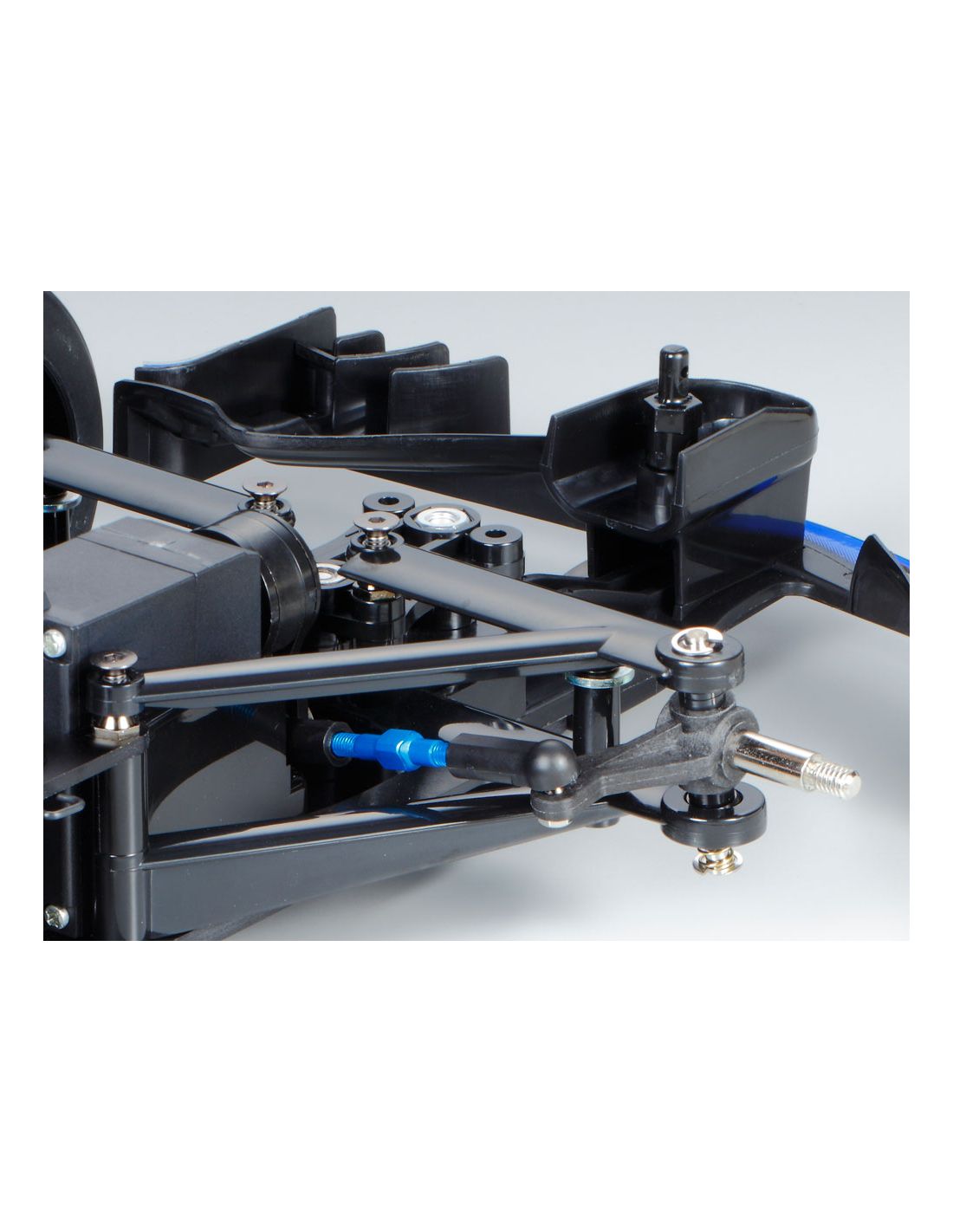La suspension arrière T-Bar associée à l’amortisseur central améliore la motricité et la stabilité dans les virages rapides. Cette architecture est très utilisée dans les voitures RC de type Formule 1 pour optimiser le comportement dynamique.