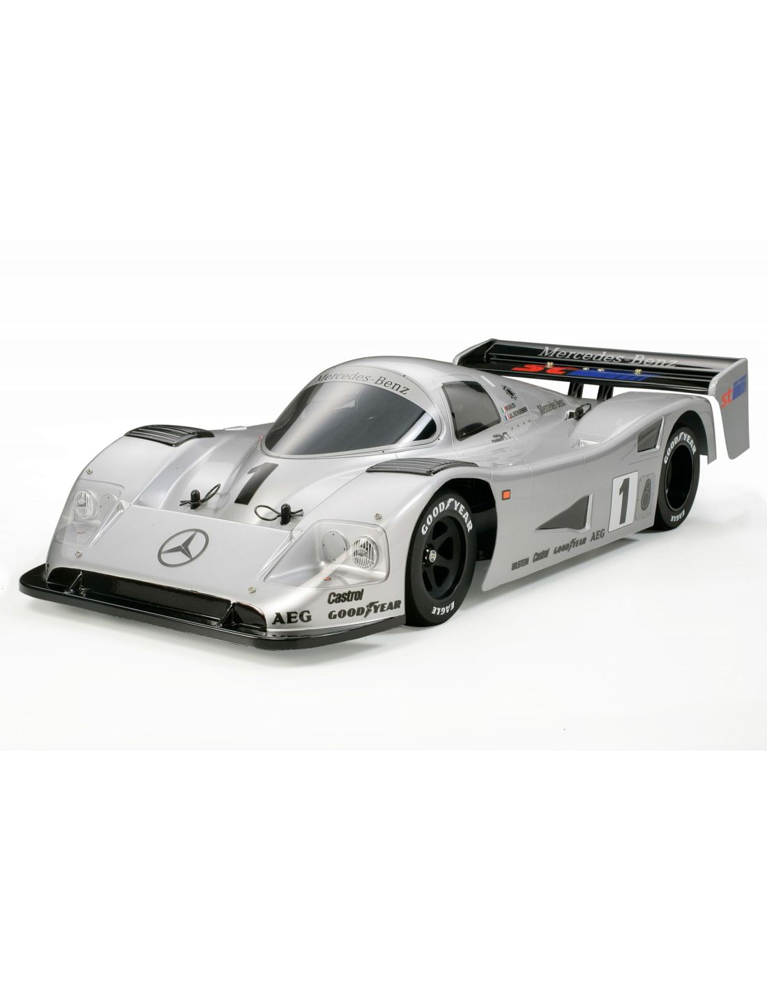 Voiture radiocommandée électrique de piste 1/10. Carrosserie de Mercedes C11 sur châssis baignoire.