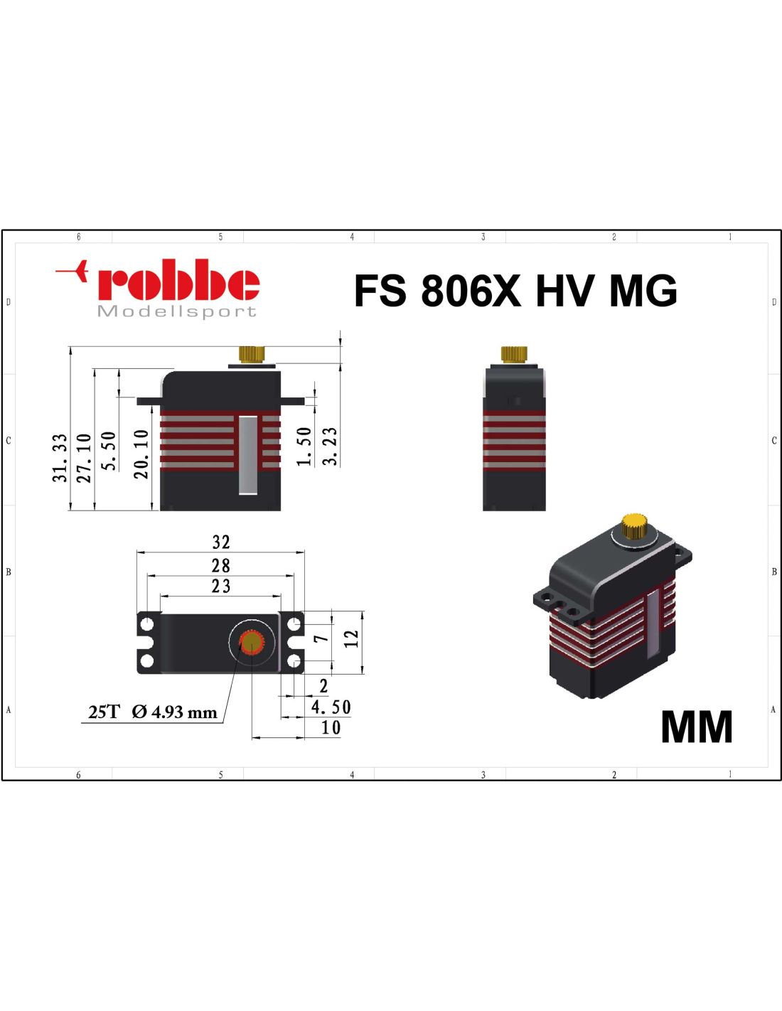 Le Robbe FS 806X est un mini-servo de la classe 12mm extrêmement robuste pour sa taille, dans un boîtier compact en aluminium fraisé CNC avec des ailettes de refroidissement fraisées pour une meilleure dissipation de la chaleur. Il est doté d’une transmission en acier stable mais sans jeu et d’un roulement à billes au niveau de la sortie. Le FS 806X a une force de réglage élevée de 7,7 kg/cm à 8,4 volts et un temps de réglage très faible. Il est donc utilisé dans les modèles de vol électrique et de planeur jusqu’à 5 m d’envergure sur les ailerons et les volets, ainsi que sur les gouvernails de profondeur et les gouvernails. Mais aussi dans les hotliners modernes ou les voiliers des classes F3B/F3F, etc. , où des forces élevées sont requises, il est utilisé avec ses dimensions réduites pour les gouvernails de profondeur et de direction.